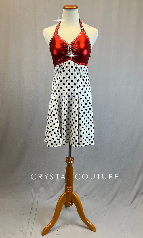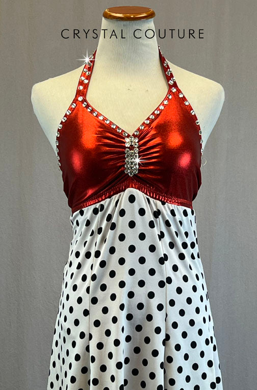 Halter dress with attached leotard is Metallic Red. Skirt portion of dress is White with Black polka dots. 1 Gross of Crystal 40ss Rhinestones!