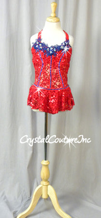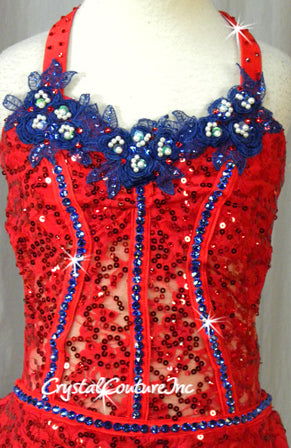 * Adorable custom made Red sequined lace halter leotard with attached circle skirt Corset style costume has a built in Red lycra bra, briefs and low open back. Costume is decorated with Royal embroidered floral lace/pearl appliques accented with Swarovski rhinestones and Red flower trim.