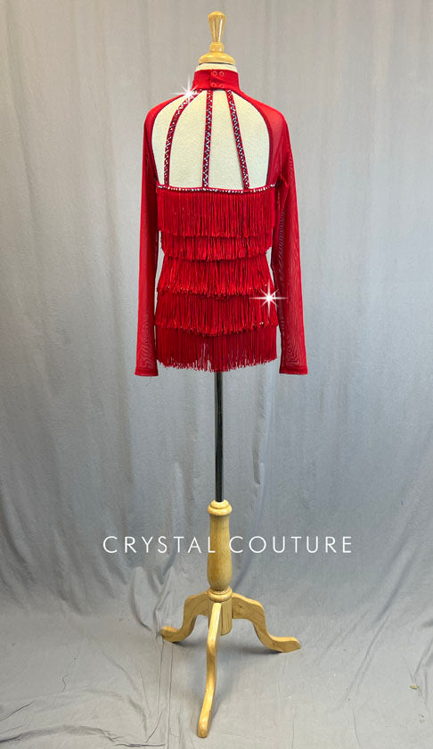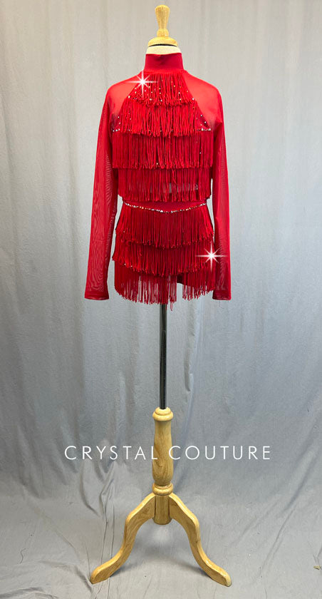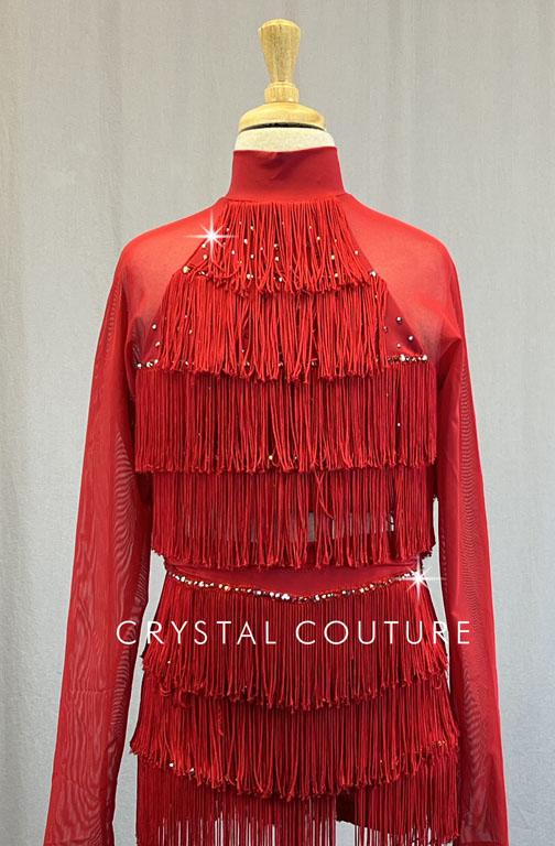 Red Fringe Two Piece with Long Mesh Sleeves - Rhinestones