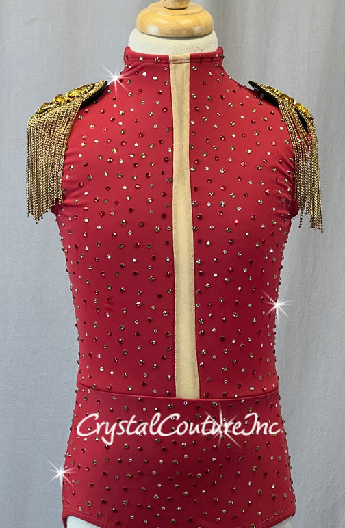 Red High Neck Leotard with Gold Chainmail Epaulettes - Rhinestones
