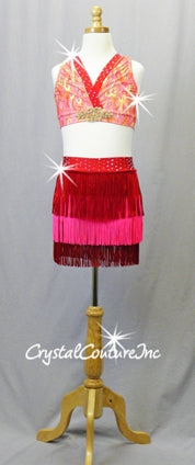 Sassy Red and Hot Pink 2 piece top and booty short with fringe skirt. Top is Red, Pink, Orange & Yellow flame print with sheer mesh racerback. Booty shorts have alternating Red and Hot Pink chainette fringe. Costume is decorated with Gold bead/Crystal AB applique and rhinestones!