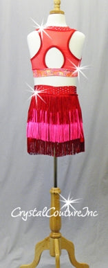 Red & Hot Pink 2 Pc Top and Booty Shorts/Fringe Skirt - Rhinestones - Swarovski Rhinestones