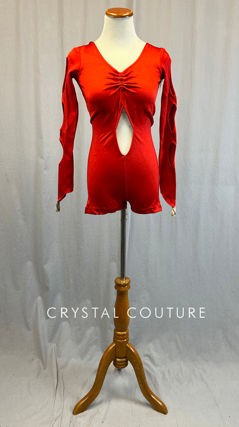 Red long sleeved biketard has front and back V neckline with diamond cutout on center of midriff. Long sleeves have finger loop and three oval cutouts on the top of each arm. Check out our rhinestones to add your own design to this costume!
