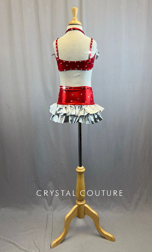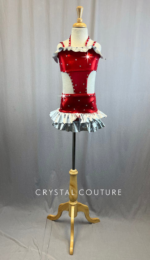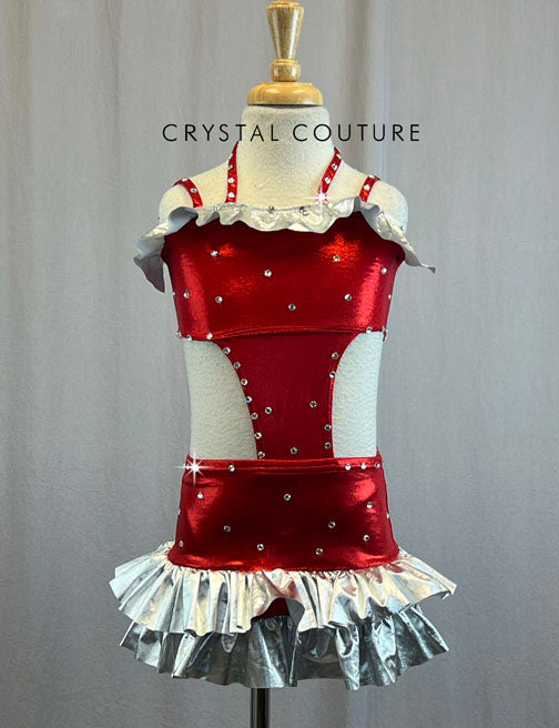 Red lycra two piece with attached briefs and Silver metallic ruffle trim on top as well as the bottom of the skirt. One gross of Crystal rhinestones in size 30ss sprinkle this costume for added sparkle along straps, trim and bodice.