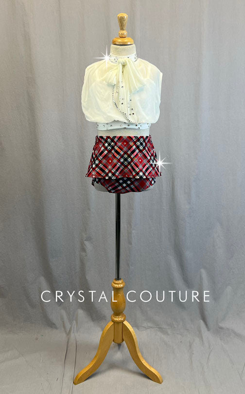 Red plaid schoolgirl skirt and White chiffon high neck crop top with built in white Lycra bra. 1 gross crystal 30ss and 1 gross crystal 20ss on crop top and .5 gross Crystal 30ss and .5 gross crystal 20ss on skirt.