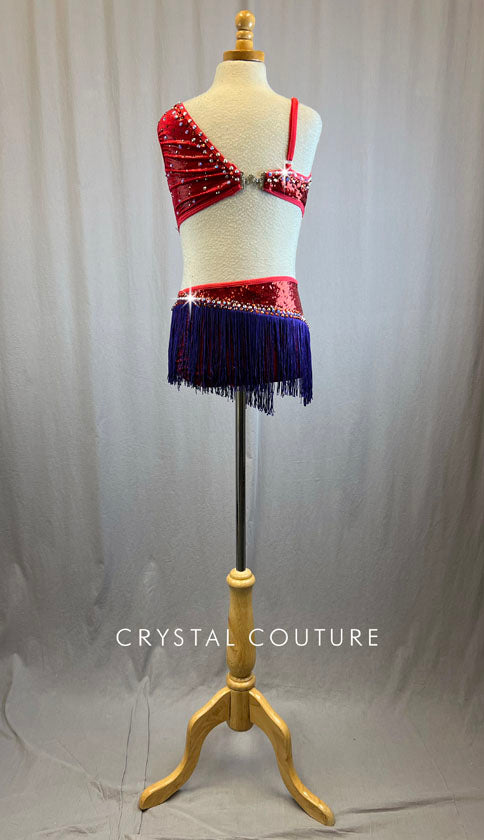 Red sequin lycra on one half and Red sparkle lycra on the other half! Low open back features a metal rhinestone closure. Attached Purple fringe skirt with over 2 gross of Light Siam amd Crystal AB 30ss rhinestones.