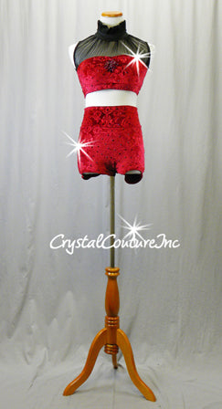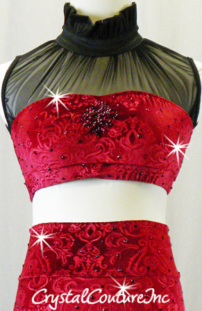 Red patterned velour crop top with Black mesh and ruffle neckline. Red velour bootie shorts, and optional Black puffy satin lace-up shorts. Costume is embellished with Swarovski rhinestones!! Almost 3 gross Swarovski XIRIUS Siam 20ss rhinestones!!