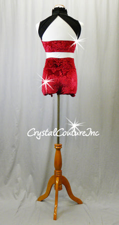 Red Velour Crop Top/Bootie Shorts with Black Puffy Shorts - Swarovski Rhinestones