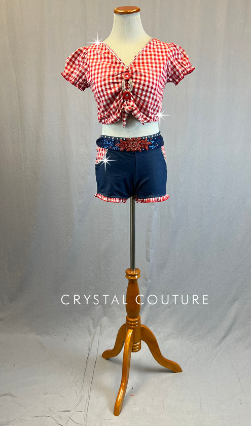 Red & White Checkered Top with Stretch Denim Shorts - Rhinestones