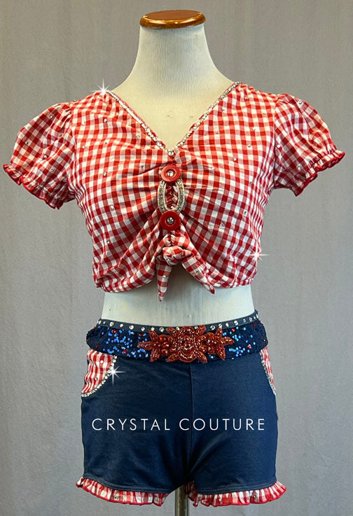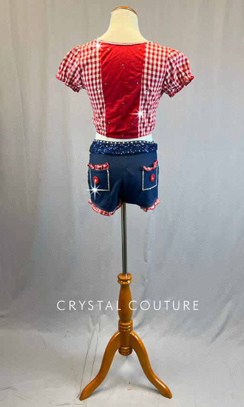 Red and White checkered top has short sleeves and is tied at front. Red center panel vertically down back. Shorts are denim patterned lycra with checkered pockets and ruffles around hem of each leg. Navy Blue sequins on waistband with Red applique at center. Back pockets each have one Red button and checkered ruffle lining top. 3 Gross of Crystal 20ss, 30ss, and 40ss Rhinestones!
