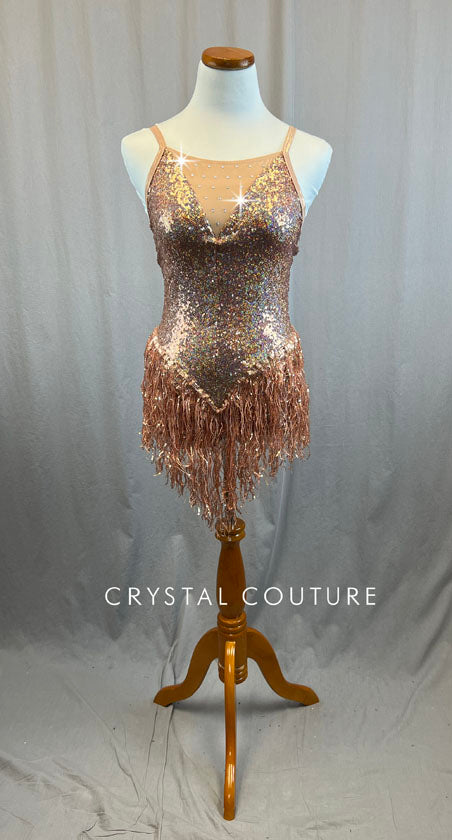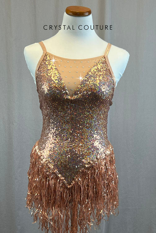 Rose gold zsa zsa leotard with mesh insert and rose gold fringe skirt. Accented with 1 dozen crystal rhinestones.