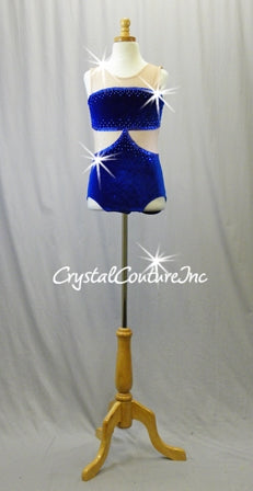 Royal Blue Velour Leotard with Nude Mesh Accents - Rhinestones