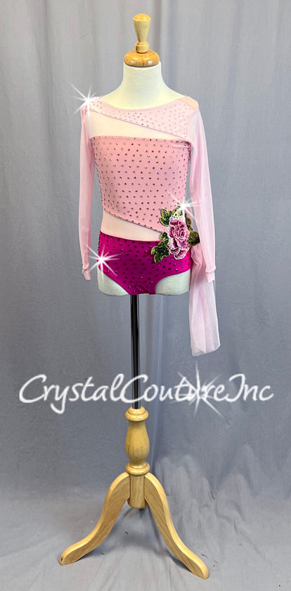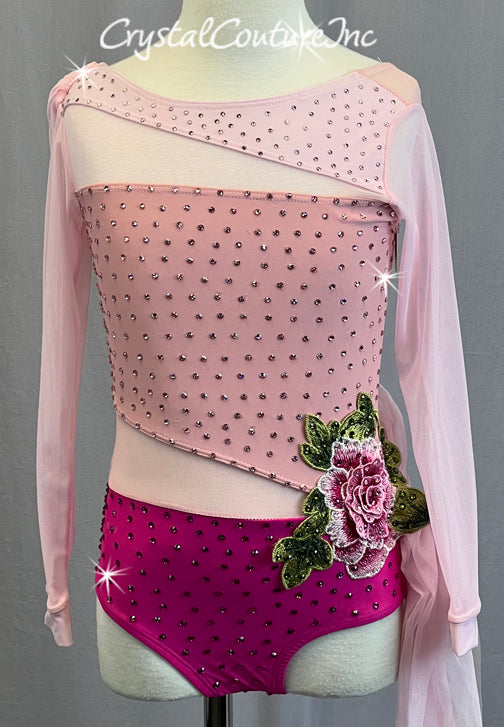 Baby Pink mesh covers full back, long sleeves, and cutouts between three front sections. Top section of front is a Baby Pink lycra on upper chest. The middle section is a Light Pink covering the majority of the midriff. Bottom section is a Bright Pink trunk. Leotard is covered with corresponding colored rhinestones. There is a 3D floral applique on the front left hip and a small mesh side bustle.