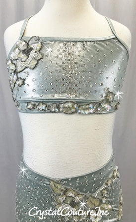 Shimmery Lt Grey lycra top and booty short decorated with Graphite beaded/Iridescent sequin/pearl appliques and LOTS of Swarovski rhinestones!