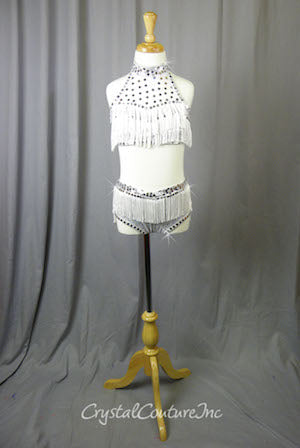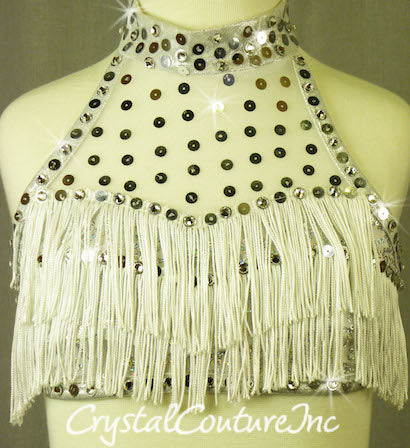 * Sassy White 2 piece halter top and trunk with fringe. Shimmery lycra bands are decorated with silver metallic sequins and Swarovski rhinestones. Bottoms are low cut.