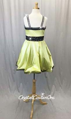 Forty's inspired Yellow liquid lycra dress with Black lycra trim, buttons and Crystal Swarovski rhinestones. Costume has attached Black briefs and Black tulle underneath to add volume to the skirt.