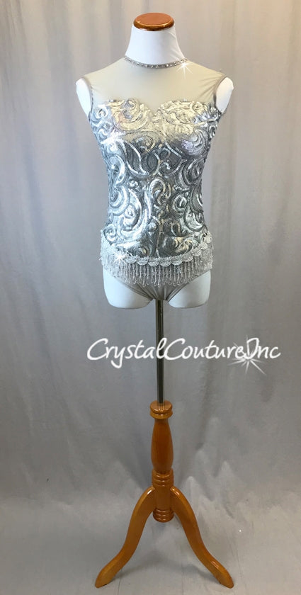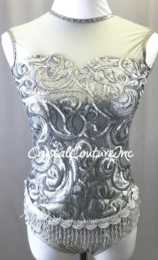 Silver Matte Sequin Leotard with Beaded Fringe -Swarovski Rhinestones