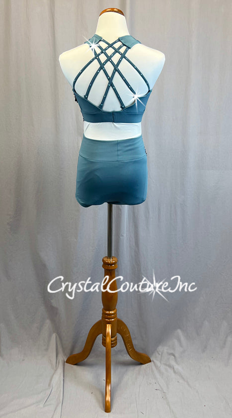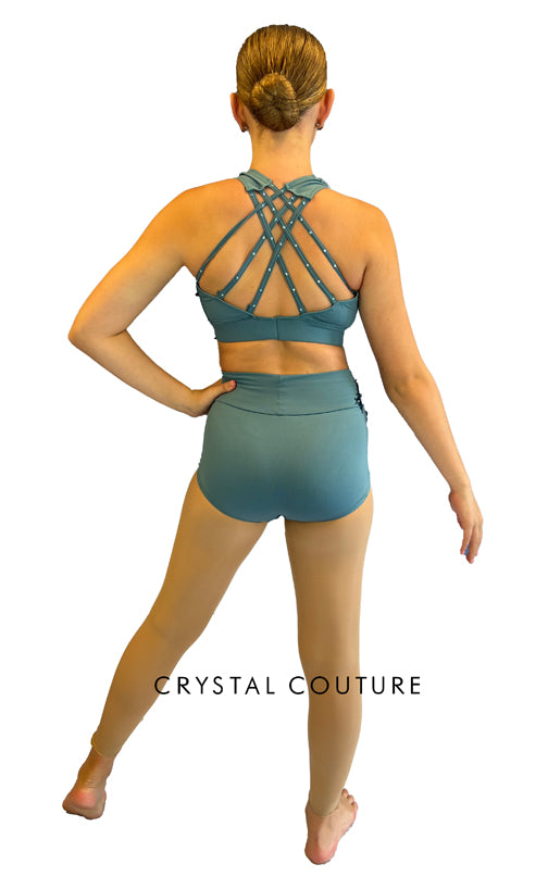 Smoky Teal Strappy Back Top with High Waisted Trunks - Appliques and Rhinestones