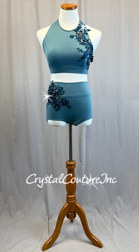Smokey Teal bra top lattice style strapping in back and Navy Blue and 3D floral appliques on left side. High waisted trunks have matching appliques on right hip.