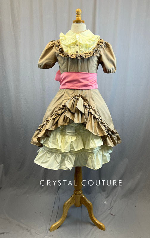 Tan 50s inspired dress with 3-layer tulle skirt and pink waist tie. Zipper up the back and zipper on side for convenience.
