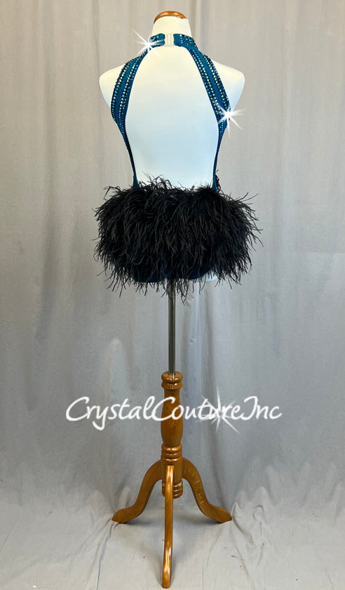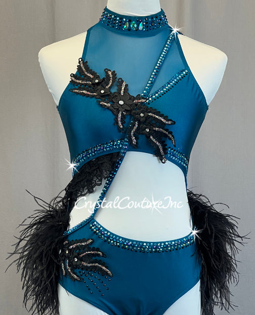 Teal Connected Two Piece with Black Feather Bustle - Rhinestones and Appliques
