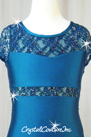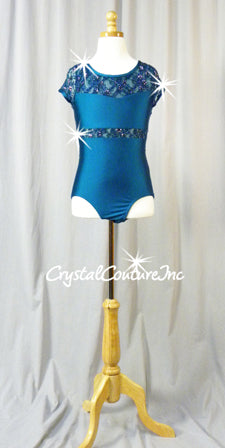Teal Short-Sleeved Lycra Leotard with Floral Lace and Swarovski Rhinestones