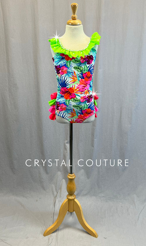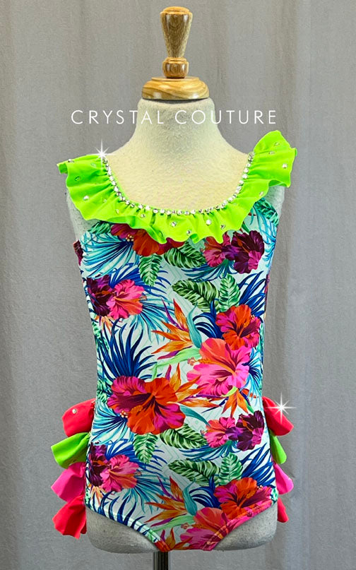 Tropical Floral Leotard with Neon Pink, Orange and Green Ruffles