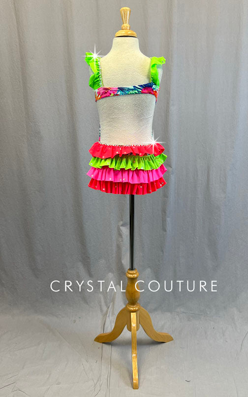Tropical floral leotard with Neon Pink, Neon Orange and Neon Green ruffles. Over a gross of size 30ss Crystal rhinestones are scattered throughout ruffles and trim of neckline and back.
