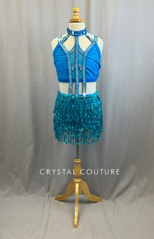 Turquoise Strappy Lace Leotard with Sequin Fringe Skirt - With Rhinestones