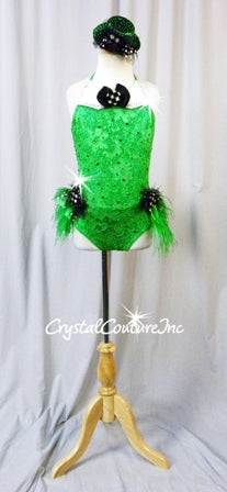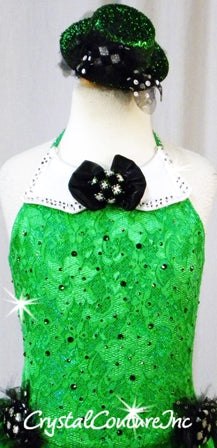 Tuxedo inspired, custom made Kelly Green floral lace halter leotard with chiffon and feather bustle. Costume is lined with shimmery Kelly Green lycra and has a low open back. Accented with White collar, Black bow tie, Black/White polka dot tulle, large Silver/Black checkered buttons and Swarovski rhinestones!