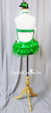 Tuxedo Inspired Kelly Green Lace Leotard with Feather & Chiffon Bustle - Swarovski Rhinestones