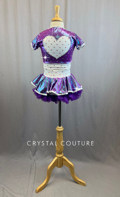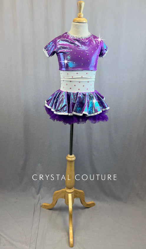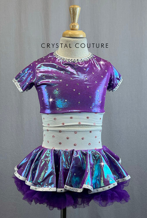 Two Piece Iridescent Purple and White Crop Top and Skirt With Rhinestones