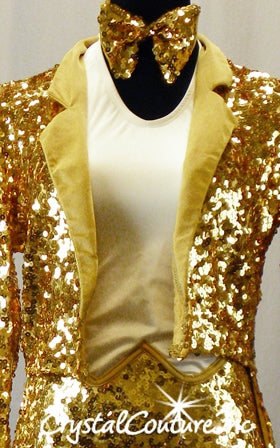 Sequins galore! White lycra halter leotard with Gold sequin trunk and trimmed with Gold lycra. Paired with Gold sequin jacket with tails and, Gold lycra lapels.