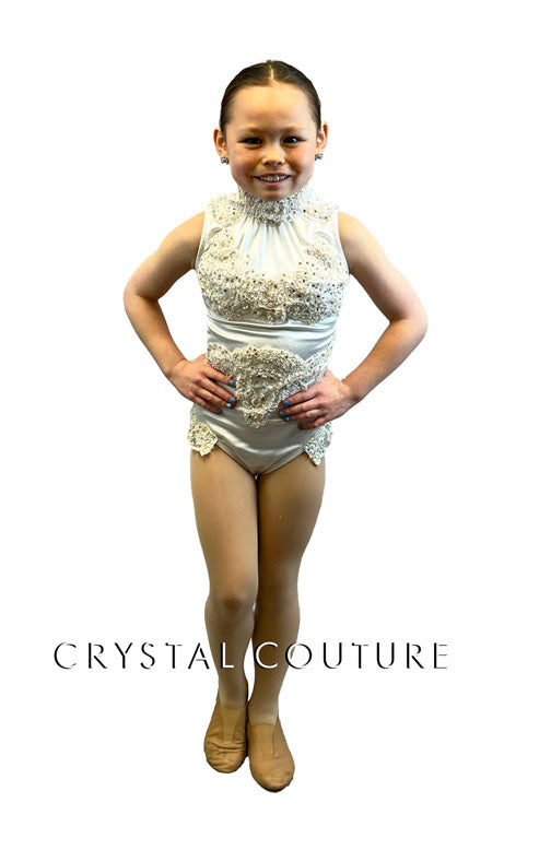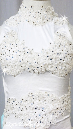 * Shimmery custom made White lycra leotard with White/Ivory embroidered lace and pearl trim/appliques. Costume has mock neck, low open back with clear adjustable strap and Lt Blue back bow (could be easily removed). Decorated with lots of Swarovski rhinestones!