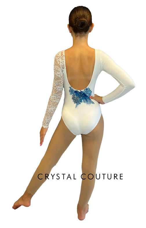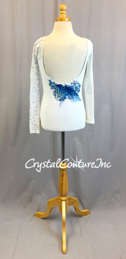 White lycra and floral lace long sleeve leotard with asymmetrical lace neckline and one lace sleeve. Decorated with Royal Blue embroidered/sequin appliques plus embroidered Blue and Purple appliques encrusted with Swarovski rhinestones! This is a seamstress sample, brand new!
