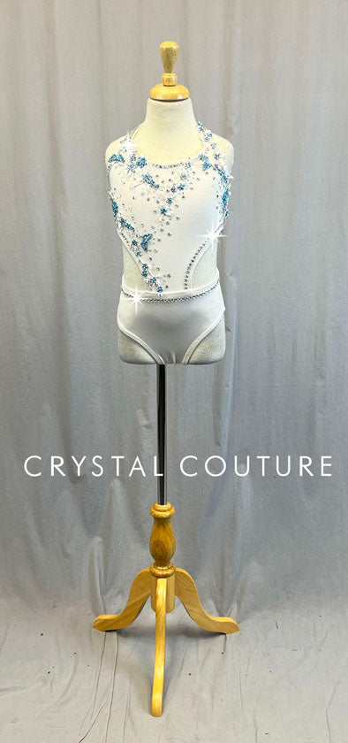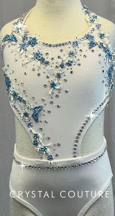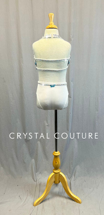 Beautiful White custom made connected 2pc with embroidered White and Lt Blue appliques all decorated with Swarovski rhinestones. Costume lined with Nude lycra.
