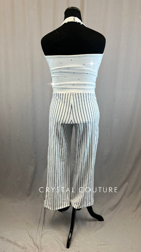 White pinstriped two piece set. White halter top with button accents paired with high waisted white with navy blue pinstripe flare pants. Accented with 1 gross of Crystal rhinestones. Accessories include black gloves and black top hat.