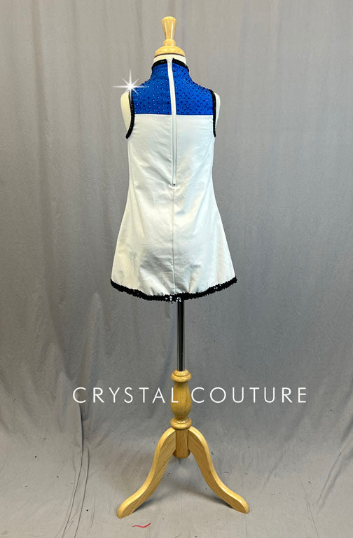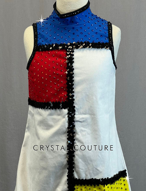 White mock neck shift dress has full zip back closure. Red, Blue, and Yellow color blocking with Black sequined edges. 5 gross of rhinestones added.