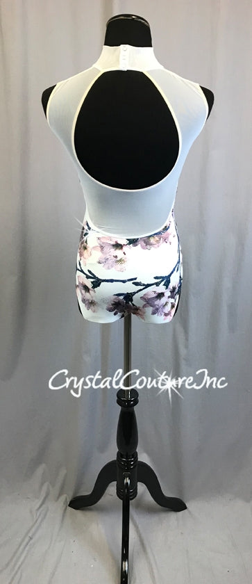 White print lycra leotard with soft Pink/Purple/Blue/Tank flower and vine design. Costume has Mock-neck, sheer White mesh neckline and back. Decorated with Swarovski rhinestones!