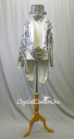 Sequins galore! White lycra halter leotard with Silver sequin trunk and trimmed with Silver lycra. Paired with Silver sequin jacket with tails and , Silver lycra lapels.