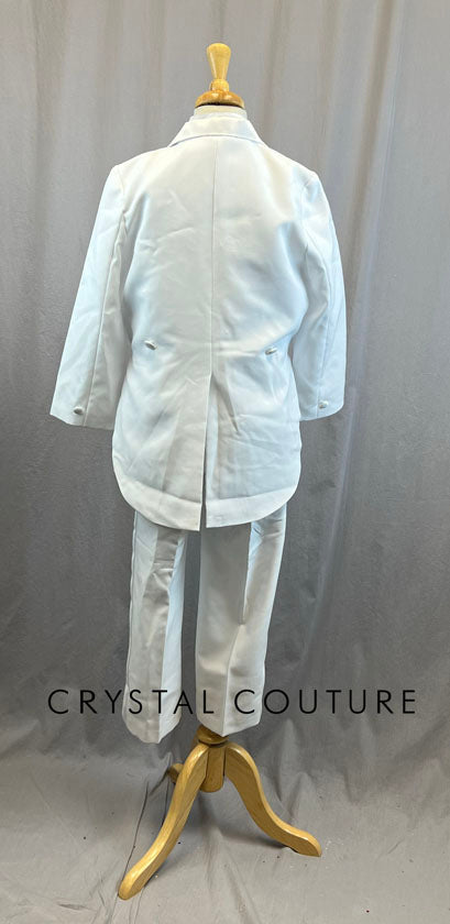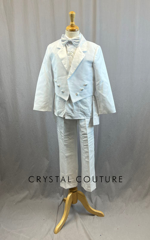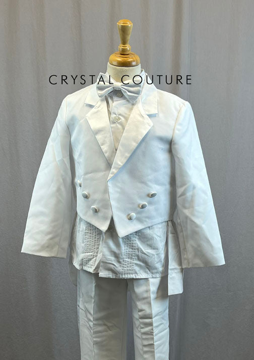 White three piece tuxedo set includes, white blazer with coattails, pleated white collared button-up, and white dress pants. Accessories include a white cummerbund.