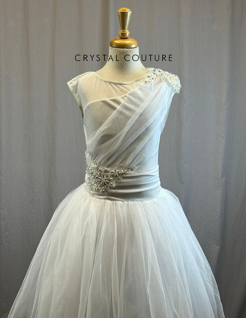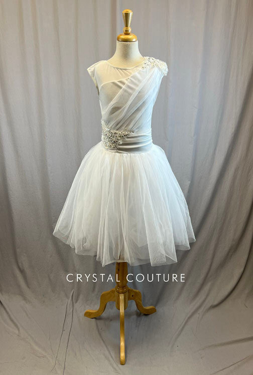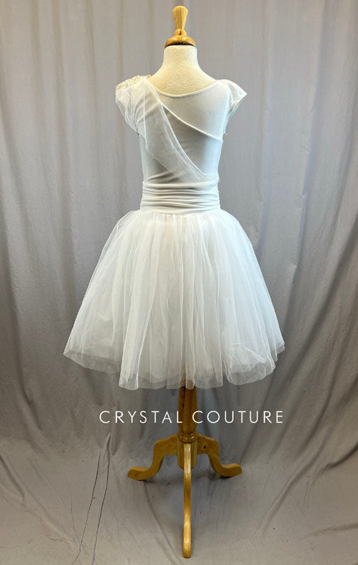 White velvet and tulle ballet dress has multi-layered tulle skirt, velvet bodice that has sequin and floral appliques, and attached lycra brief. Accessories include applique hairpiece.
