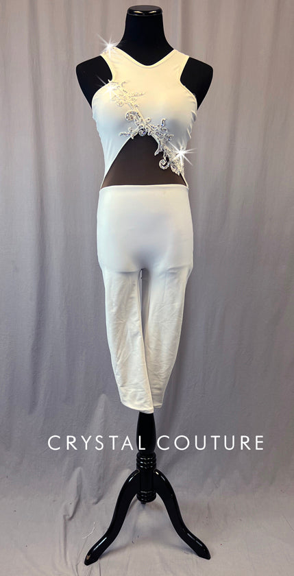 White Unitard with Appliques and Mesh Cutouts - Rhinestones