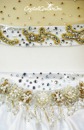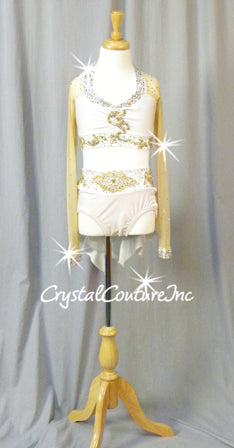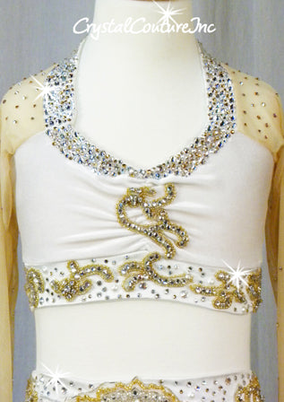 Stunning White velour and lycra 2 piece top and brief/half skirt with Nude sheer mesh long sleeves and back. Costume is decorated with lots of Swarovski rhinestones plus Gold beaded/Crystal rhinestone and Gold/Silver Beaded Pearl appliques! Back half skirt with "pick-ups" has Pearl/Beaded/Dangling beaded trim.