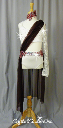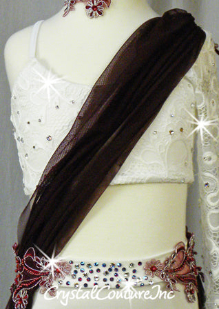 White and Burgundy connected 2 piece, White open net/lace covered crop top with White lycra trunk and Burgundy sheer mesh long skirt. Costume is decorated with Burgundy/Silver embroidered appliques and Swarovski rhinestones!