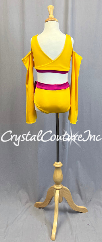 Bright Yellow cold shoulder bra top with long bell sleeves. Band around the ribcage is a Deep Pink with a small bow tied on the front. Trunks are Yellow with matching Pink waistband and bow tied at the front left hip bone above a small keyhole cutout. Custom made by The LineUp.