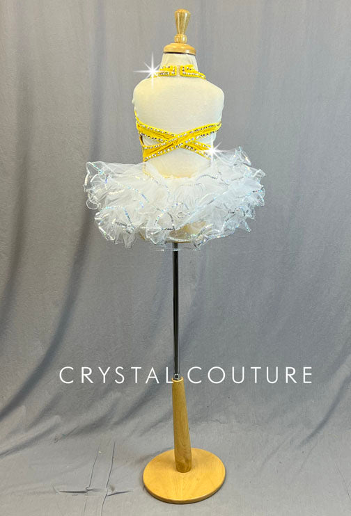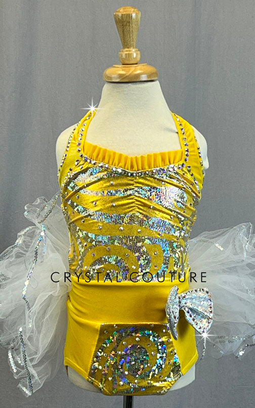 Yellow velvet lycra and Yellow shiny lycra with Silver iridescent shatter glass swirl pattern. This adorable halter leotard is trimmed in Crystal AB 20 and 30ss rhinestones all along the trim, straps and back. The bustle is made from white tulle with silver iridescent sequin trim. Rhinestoned trimmed bow on hip.
